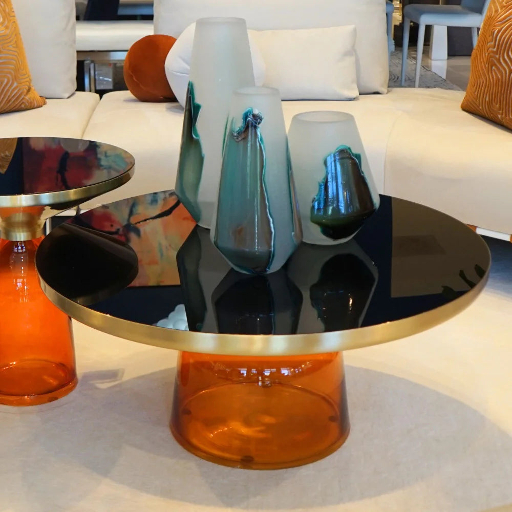 Elevate your space with the RITZ 35", featuring a sleek black glass top paired with a vibrant orange or blue blown glass base. This unique piece showcases expert Italian craftsmanship, combining modern design with artisanal glasswork to deliver both style and durability. Ideal for adding a sophisticated focal point to any room.