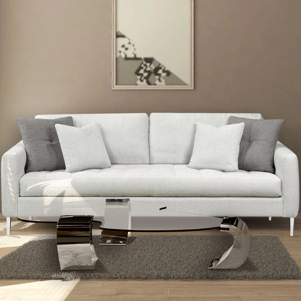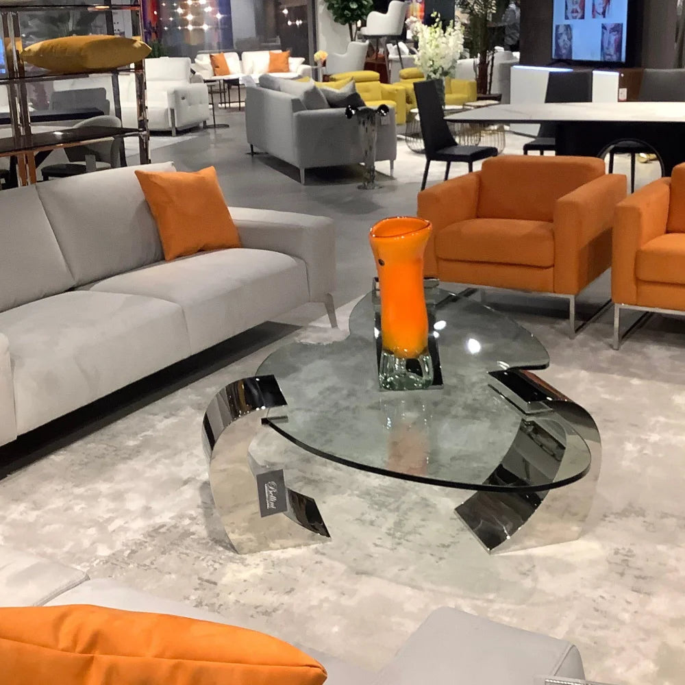 The KATNISS-S coffee table combines a unique clear S-shaped tempered glass top with polished stainless steel legs for a striking modern aesthetic. Its tempered glass ensures durability and safety, while the stainless-steel base provides sturdy support.