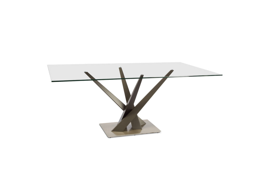 The Crystal table showcases a rectangular glass top securely held by four metal spokes, delivering exceptional support and a sleek aesthetic. Offered in two sizes and multiple color options, this piece embodies a refined modern design that enhances any contemporary living space with both style and structural integrity.