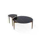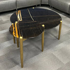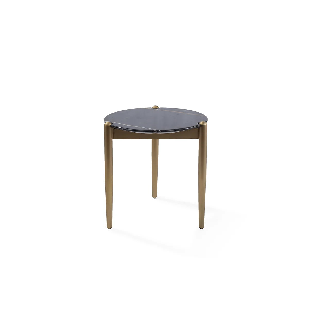 The DARIO end table features a sleek black marble top paired with a refined gold steel frame, exemplifying modern Italian design. This combination offers durable elegance, perfect for elevating contemporary living spaces with a sophisticated, minimalist aesthetic.
