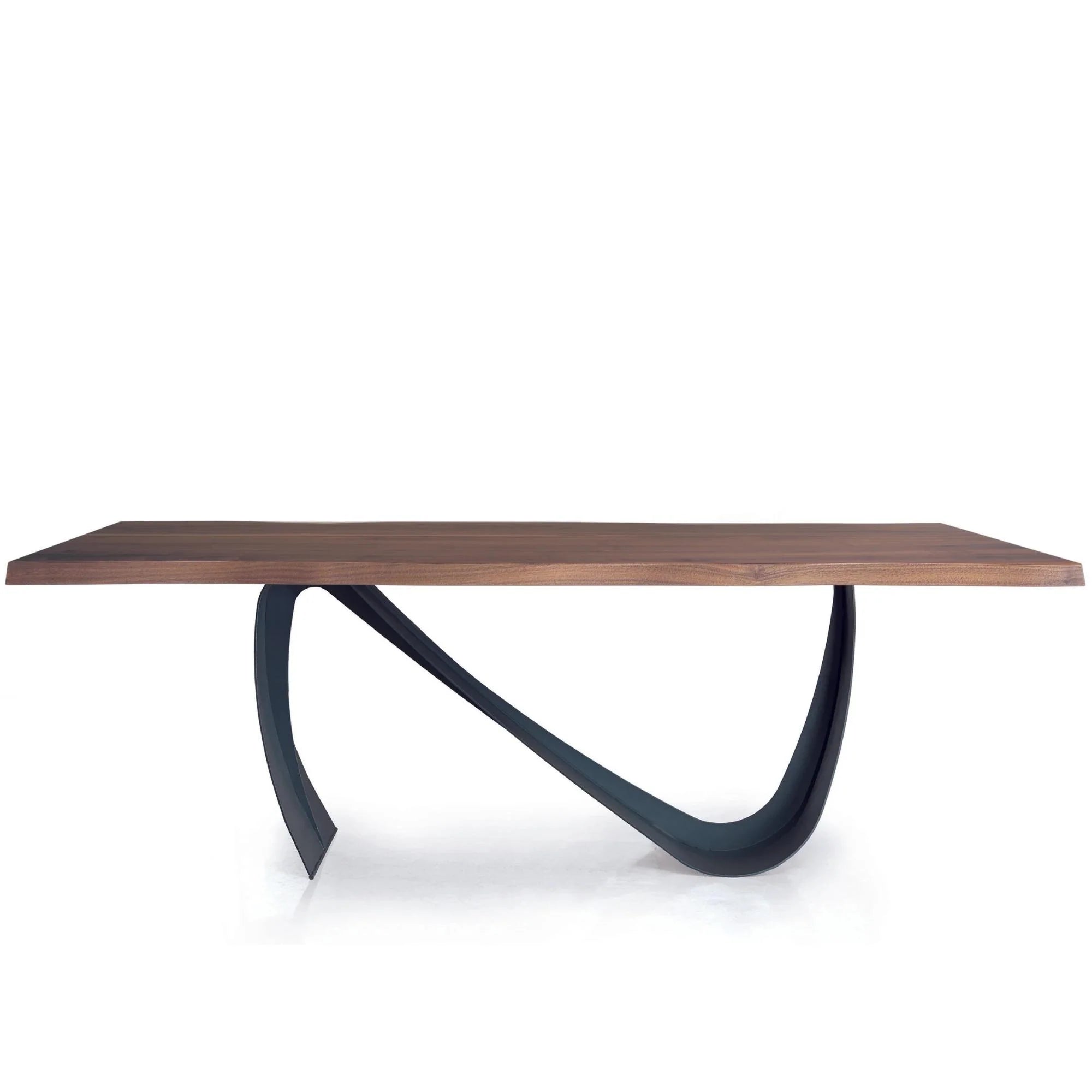 The Flex Dining Table brings a warm, inviting character and refined Italian craftsmanship to your dining room. It features a live edge veneered walnut top with beautifully rich wood grain that feels both timeless and modern, and a curved anthracite base that adds subtle contrast and architectural balance to the design.
