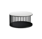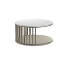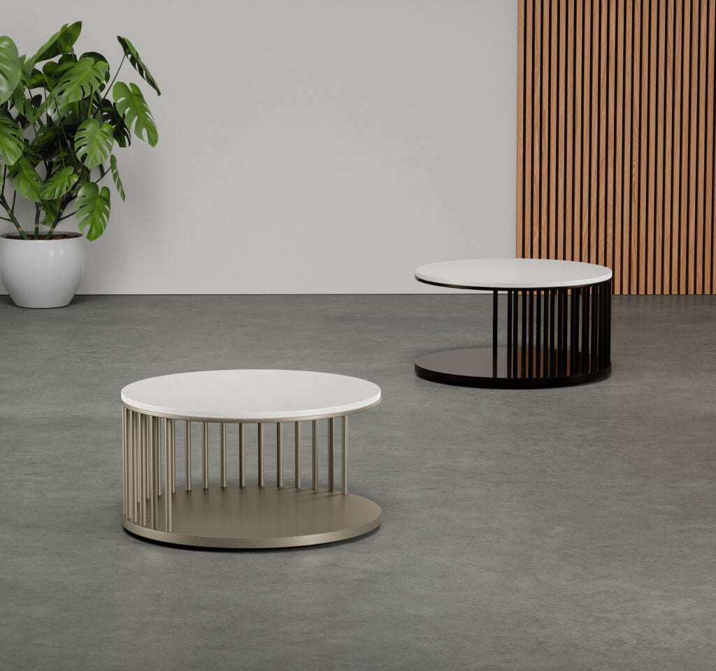 Whimsical and fun, the Spoke cocktail table has a round cultured stone top surface supported by a curved metal band. Additional upright spokes add strength and style. Hidden casters allow the Spoke to be moved with ease.